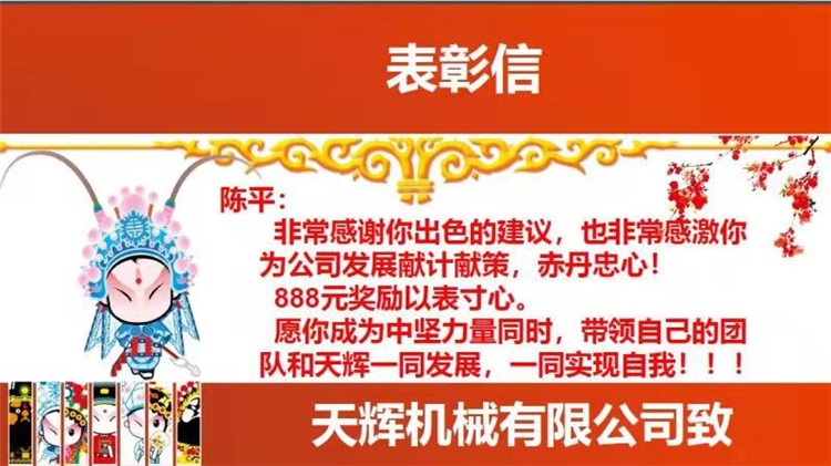 陳平先生是質(zhì)量部經(jīng)理,已在天輝機械工作10年以上!今天他為公司管理提了一個很好的建議,老板很開心,獎勵他RMR888.00以茲鼓勵!希望每一個天輝人都能像他一樣,具有主人翁精神,提更多具有建設性的建議!